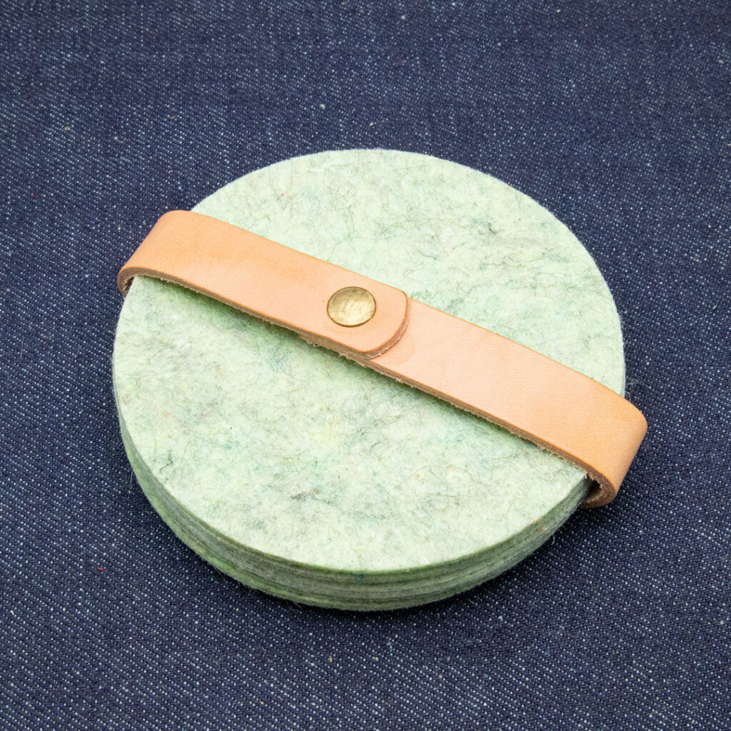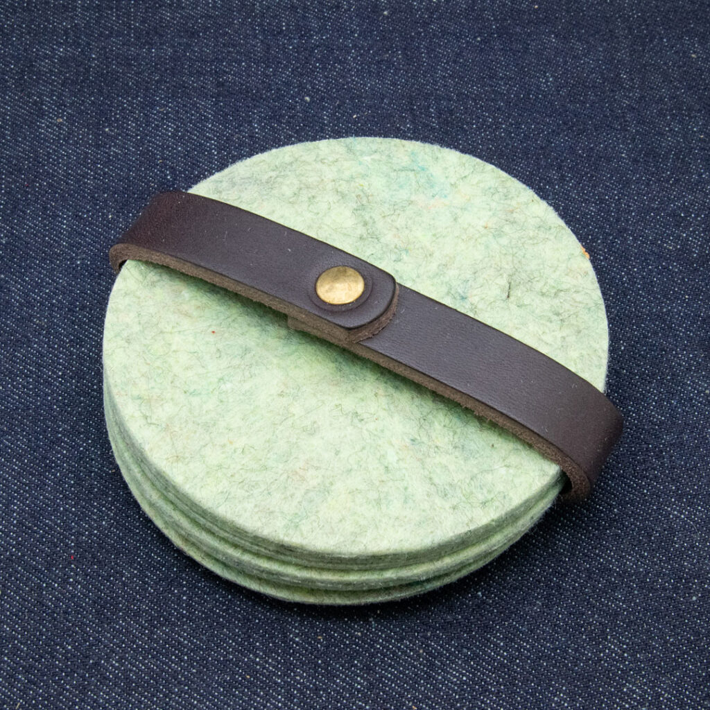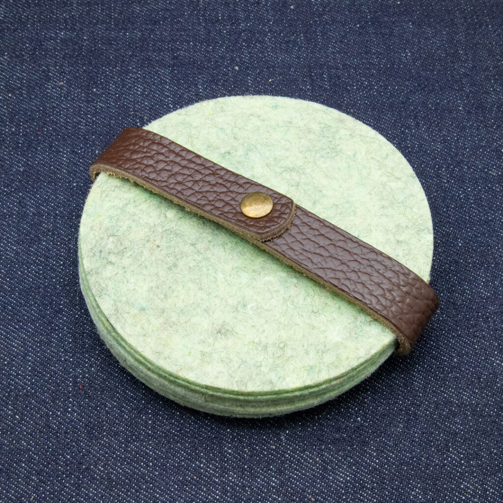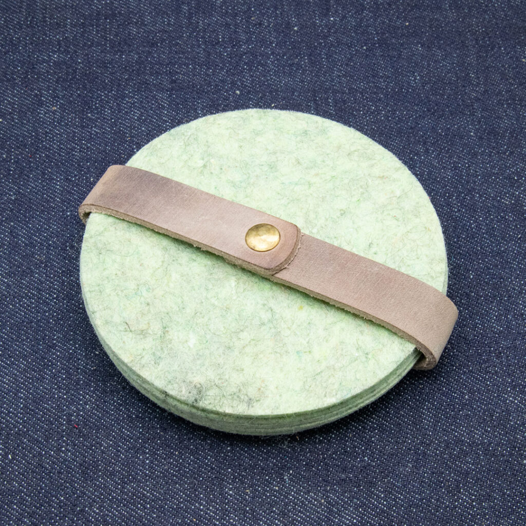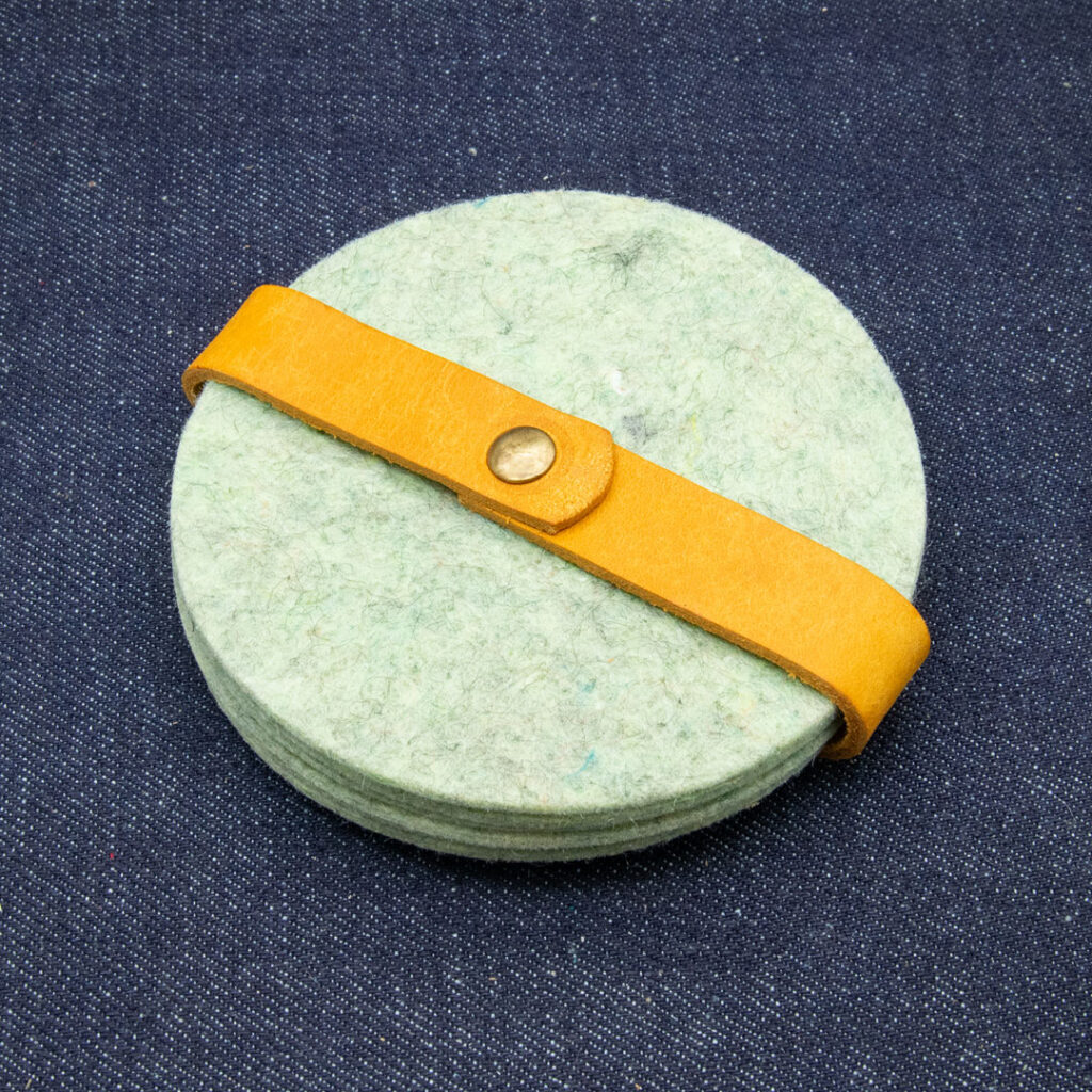Deze onderzetters zijn gemaakt van gered vilt, dat op zijn beurt weer bestaat uit gered textiel en is gemaakt door mensen met een afstand tot de arbeidsmarkt.