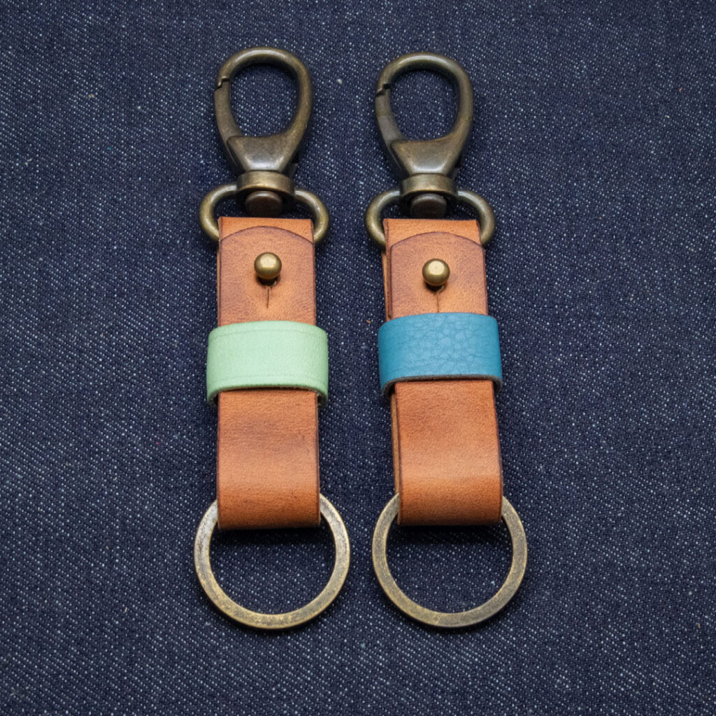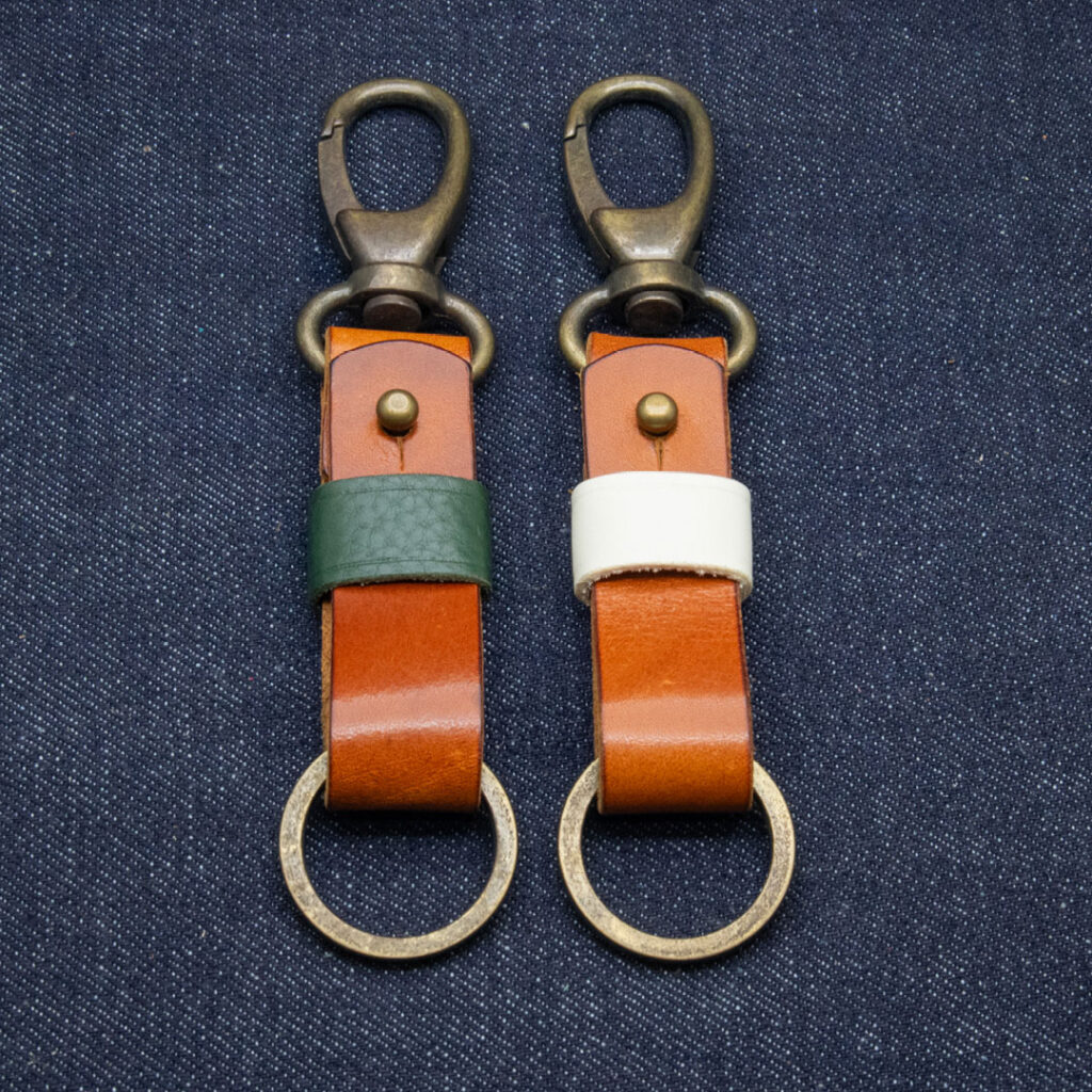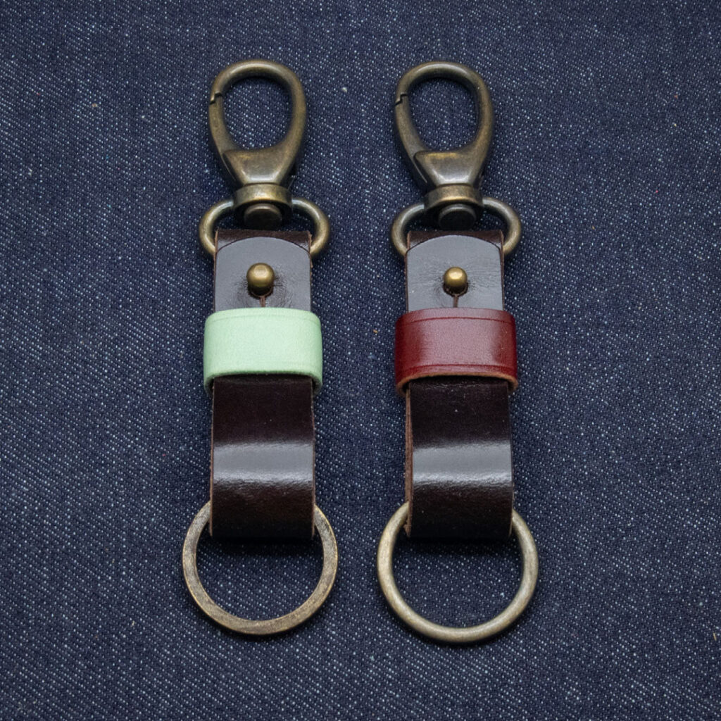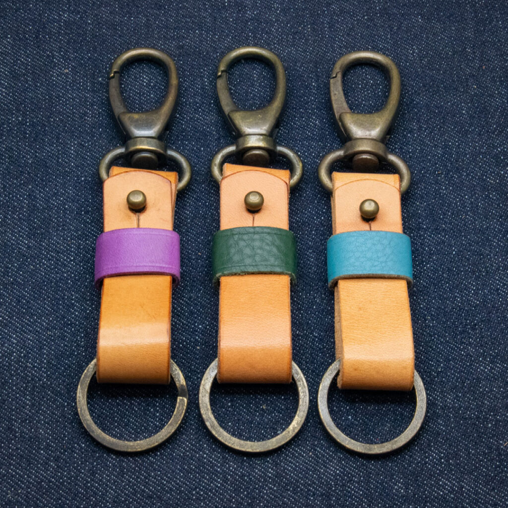 Deze sleutelhanger geeft je de mogelijkheid om eenvoudig van sleutelbos te wisselen. De gekleurde bandjes zijn gemaakt om ook deze heel kleine restjes leer nog een mooi leven te kunnen geven.